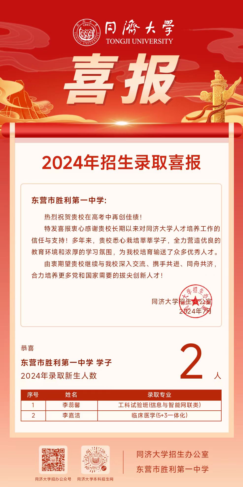 一份份录取喜报,是广大胜利一中学子奋发拼搏,将梦想照进现实的回报;也是胜利一中坚守教育初心,沉潜务实、深耕教学的有力见证;也必将进一步激励学校全面贯彻党的教育方针,落实立德树人的根本任务,努力办好人民满意的教育。