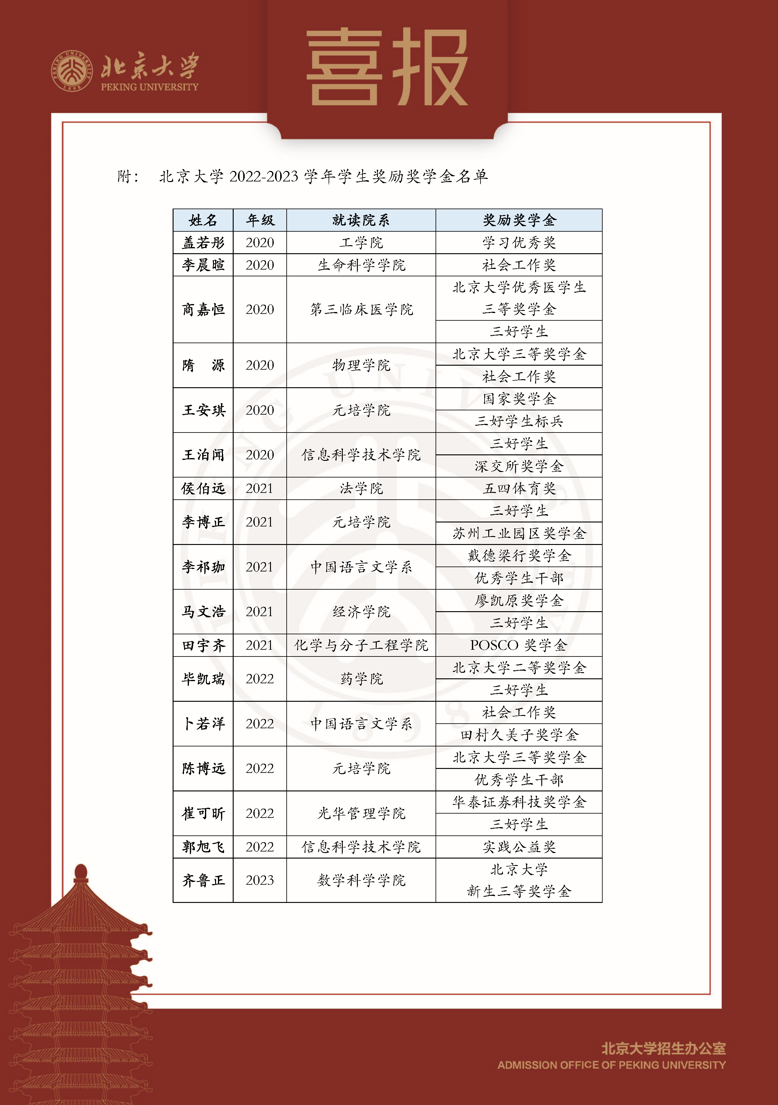 春风育桃李,杏坛尽芳菲。胜利一中毕业学子在北京大学学习过程中表现优异,捷报频传。近日,北京大学再次向我校发来喜报:我校2020-2023年高中毕业在北大就读的学生中有17人获北京大学2022-2023学年学生奖励奖学金共计28项,获奖人数和获奖总数在山东省名列前茅。这充分展现出胜利一中学子突出的学习能力和综合素质。作为北京大学博雅人才共育基地和优质生源基地,胜利一中每年向北京大学等众多知名高校输送大量志向远大、德才兼备的优秀学子,对此北京大学表示衷心祝贺和感谢。
