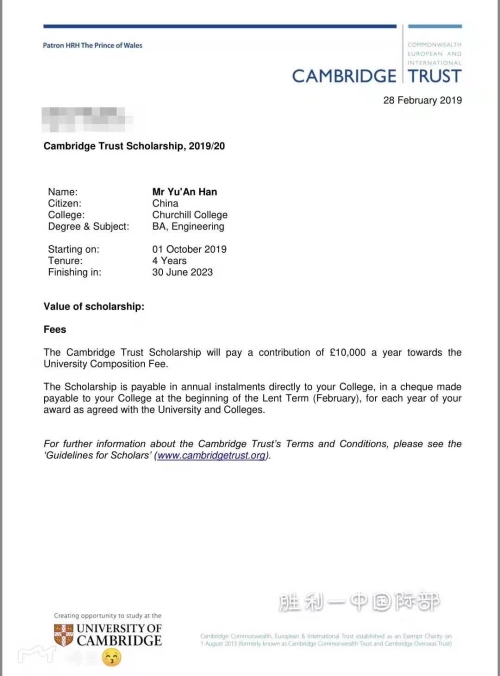 2019年2月28日,喜讯传来, 我校国际部高三A-Level课程班韩雨安同学获得了非常难得的Cambridge Trust(剑桥信托)每年10000英镑奖学金。据悉,自Cambridge Trust成立以来,每年为剑桥大学录取的极少数非常优秀的学生提供奖学金。