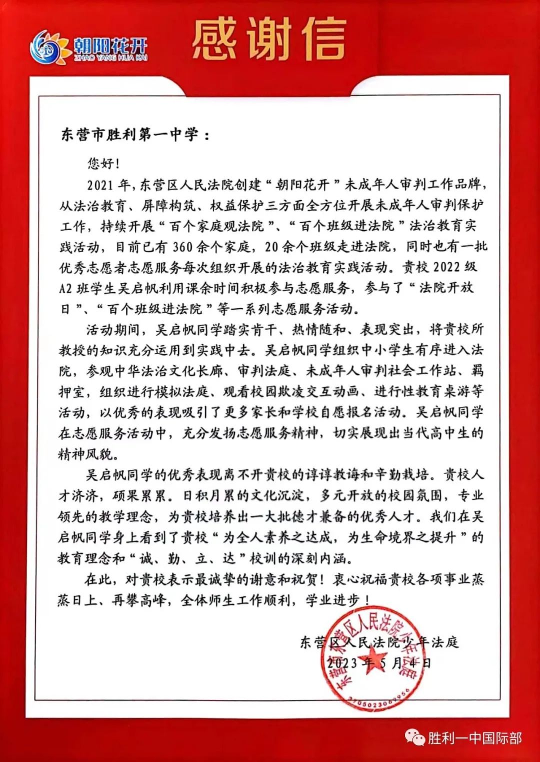 喜讯!我校国际部吴启帆同学喜获“优秀志愿者”荣誉称号! 来源:微信公众号 发布时间:2023-05-15 浏览次数: 次 【字体:小 大】 近日,喜讯传来,我校国际部吴启帆同学在东营区人民法院“朝阳花开”未成年人保护志愿服务工作中积极奉献,表现突出,获得“优秀志愿者”荣誉称号。 吴启帆同学热心公益,积极参与东营区人民法院组织的“法院开放日”“百个班级进法院”等一系列志愿服务活动,博得了一致赞扬!吴启帆同学积极融入社会、热心志愿服务、勇于承担社会责任的优秀品质充分展现了当代中学生的精神风貌和胜利一中国际部学子风采! 分享到: 【打印正文】