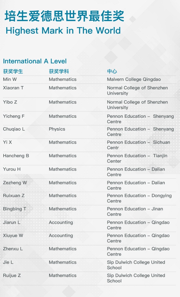 培生爱德思是英国最大的学术及职业考试认证机构,为超过80个国家和地区的170多万人提供国际考试认证服务。为了表彰取得优异成绩的学生,同时激励学生的学习热情,培生通过统计分析六月份的考试成绩,评选出三大优秀学生奖项:中国最佳奖(Highest Mark in China)、亚洲最佳奖(Highest Mark in Asia)、世界最佳奖(Highest Mark in The World)。
