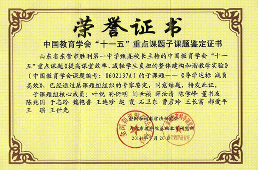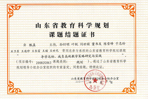 由甄熹副校长主持,初中部全体任课老师共同参与的:中国教育学会“十一五”规划课题-----“导学达标,减负高效的整体建构和谐教学实验”和山东省“十一五”规划课题“导学达标,减负高效教学策略研究与实践”两项教育教学科研课题均已完成了预期目标,并分别于2011年5月20日和9月17日顺利通过国家级和省级鉴定。中国《语言文字报》6月26日以“以课改为契机,走质量强校之路”,9月29日以“合作学习 合作教育 全面和谐发展”,分别介绍了我们的课题研究经验;《人民教师杂志》2010年第九期,以“以教育科研为平台,全面推行新课程改革”为题,刊登了该课题的研究报告。