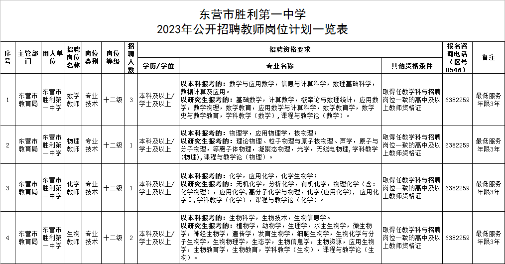 1.东营市胜利第一中学2023年公开招聘教师岗位计划一览表。