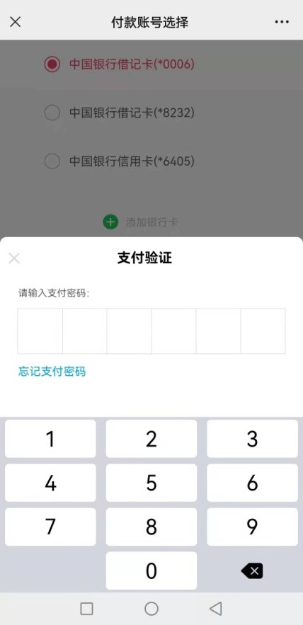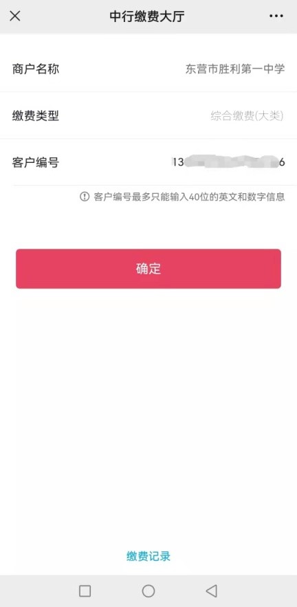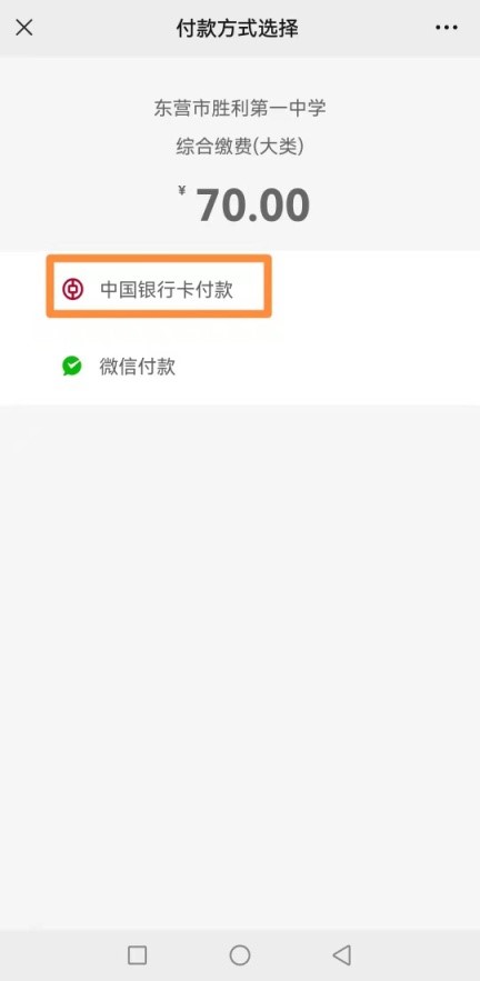 缴费补充通知 来源: 发布时间:2022-01-14 浏览次数: 次 【字体:小 大】 如微信、支付宝扫码后无法正常缴费,请用微信扫码后点击“中国银行卡付款”或登录中国银行手机银行进行缴费(中国银行卡或中国银行手机银行可以是非本人的),具体缴费流程如下: 缴费时客户编号请输入报名者身份证号!!! 缴费咨询电话:中国银行东营分行营业部0546-8928999,0546-8928601,13506366663 一、登录中国银行手机银行缴费流程 二、微信扫码选择“中国银行卡付款”缴费流程 分享到: 【打印正文】
