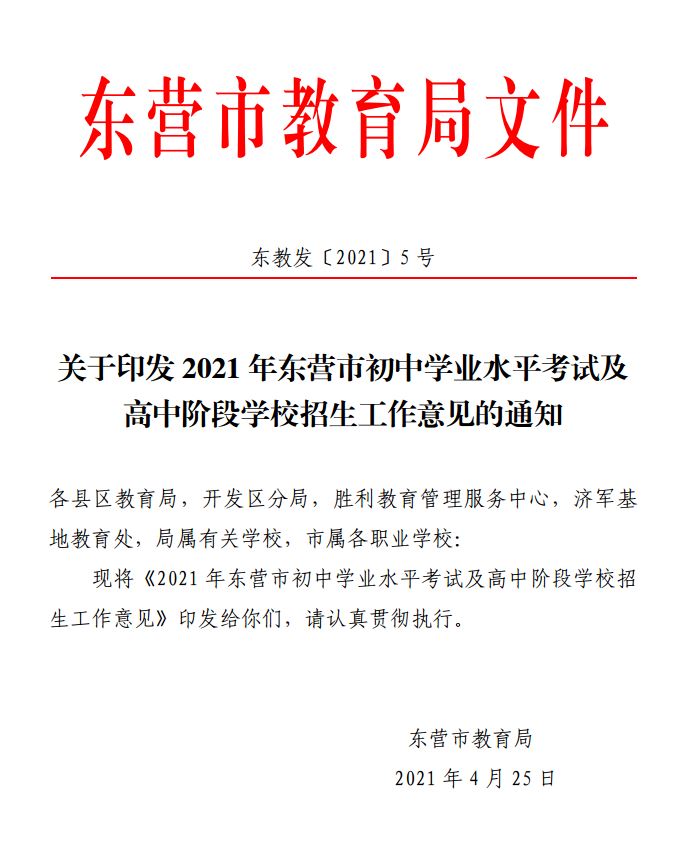 2021年东营市初中学业水平考试及高中阶段学校招生工作意见