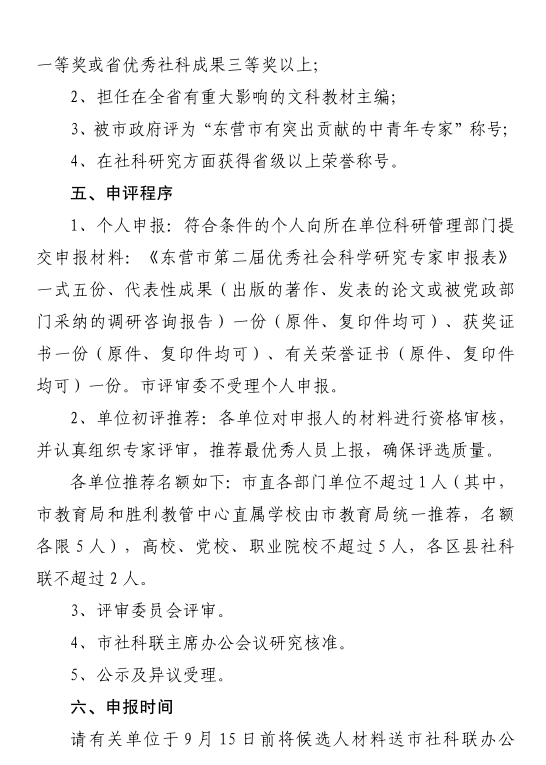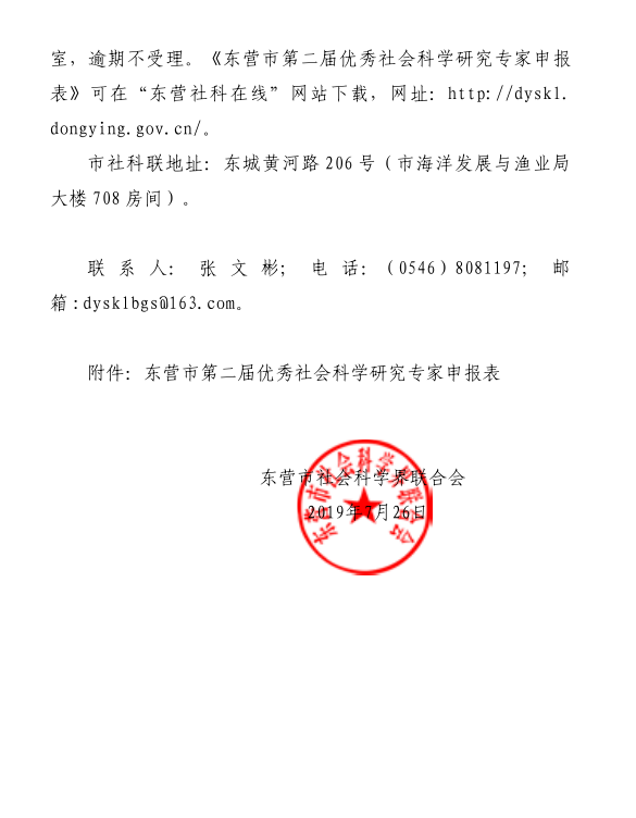 现将东营市社会科学界联合会文件《关于评选命名东营市第二届优秀社会科学研究专家的通知》(东社科发〔2019〕12 号)转发给你们,请按照文件有关要求,于9月12日前将符合条件的候选人申报材料报教科院一楼114办公室,逾期不予受理。
