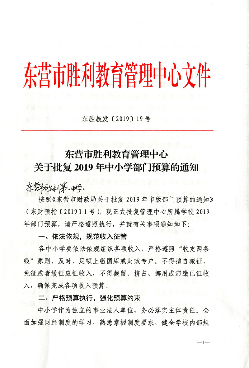 2019年东营市胜利第一中学部门预算 来源: 发布时间:2019-03-07 浏览次数: 次 【字体:小 大】 附件:2019市级部门预算批复表(一) 2019市级部门预算批复表(二) 分享到: 【打印正文】