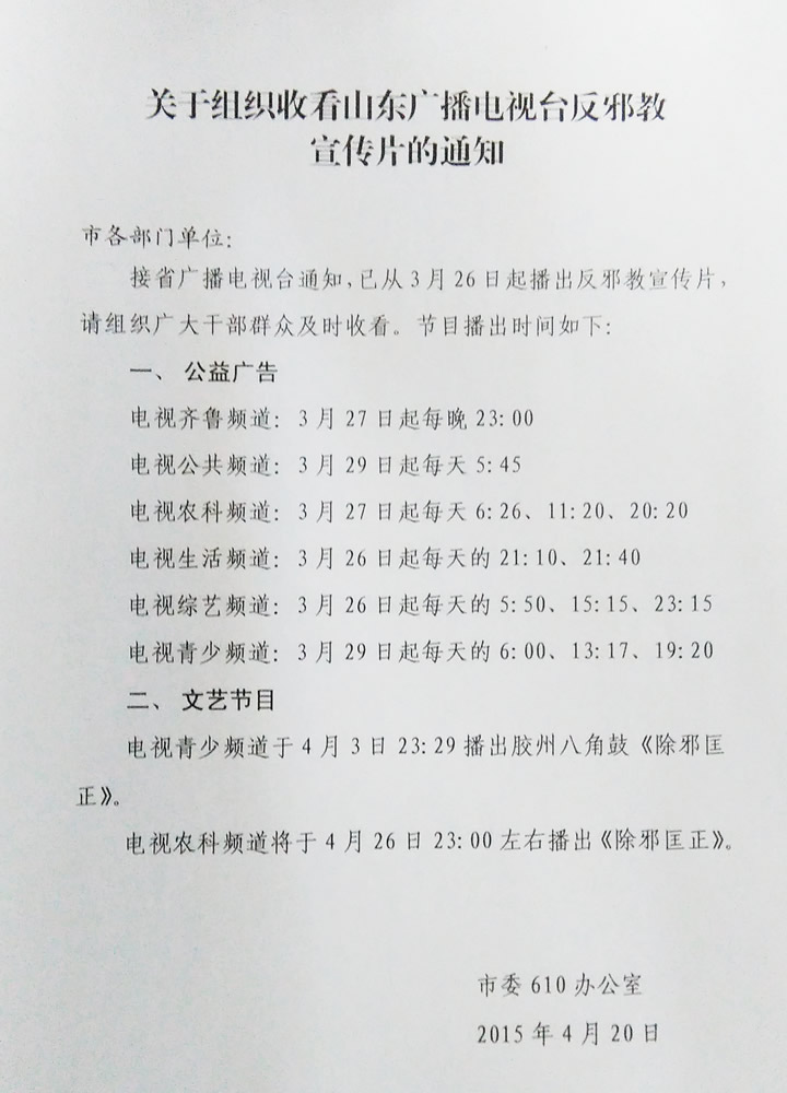 现将市委610办公室《关于组织收看山东广播电视台反邪教宣传片的通知》转发给你们,请结合实际,组织收看。
