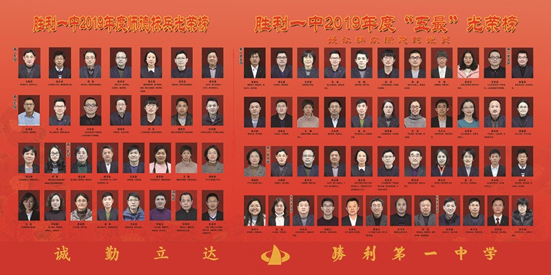 为表彰先进,进一步弘扬“敬业奉献、励志图新”的胜利一中精神,全面提升教育教学质量,经年级、处室、党支部评选推荐,学校党委研究,于2019年12月11日,授予康会展等37位班主任为学校2019年度“最让家长放心的班主任”荣誉称号,授予许永斌等85位教师为学校2019年度“最受学生欢迎的老师”荣誉称号,授予谢春生等48位党员为学校2019年度“最让群众满意的党员”荣誉称号,授予丁继奎等11位教职工为学校2019年度“最让师生满意的岗位标兵”荣誉称号,授予盖伟东等26位员工为学校2019年度“最让师生满意的服务之星”荣誉称号。