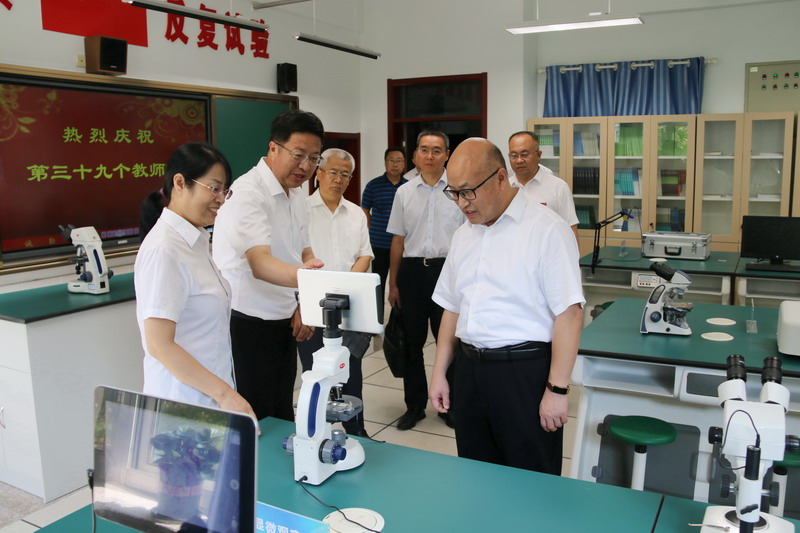 孙书记听取了学校领导关于学校基本情况的汇报,察看了校容校貌,参观了数字探究实验室、生物探究创新实验室等,并与优秀教师代表进行了亲切交流。孙书记非常关心胜利一中的建设发展,在学校展板前不时驻足,就推进学校扩建、加强队伍建设、优化激励机制等与学校领导深入交流。