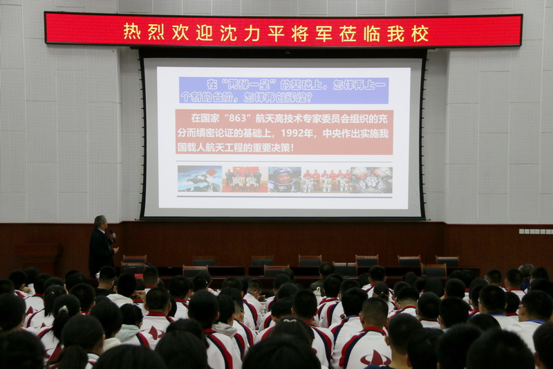 10月22日下午,中国资深航天专家沈力平院士莅临我校,为我校高一师生作《中国航天发展成就与中国航天精神》专题报告,党委书记赵汝升,党委委员、副校长高同海,党委委员、副校长谢春生等学校领导出席,谢春生主持报告会。报告会前,在学校领导陪同下,沈力平院士一行参观了校容校貌,并与学校领导进行了座谈交流。