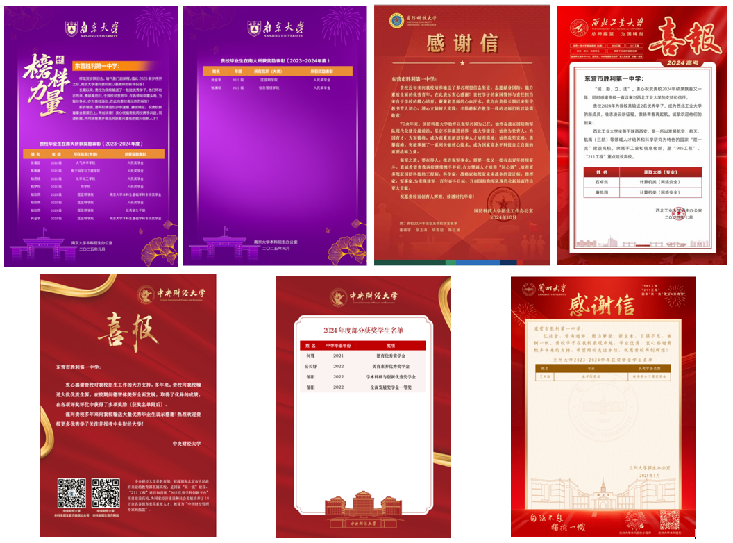 桃李芬芳,榜样引领 ——多所高校向我校发来喜报 来源:本站原创 发布时间:2025-01-20 浏览次数: 次 【字体:小 大】 砥砺耕耘结硕果,弦歌不绝奏华章。近日,国防科技大学、南京大学、西北工业大学、中央财经大学、兰州大学等名校接连向我校发来喜报,祝贺我校毕业生在大学期间荣获人民奖学金等多项荣誉和奖励。高校衷心感谢我校多年来持续输送了一批又一批志存高远、德才兼备的优秀学子,并期待与我校加强合作,携手共进,共同培育更多堪当民族复兴重任的时代新人。 分享到: 【打印正文】