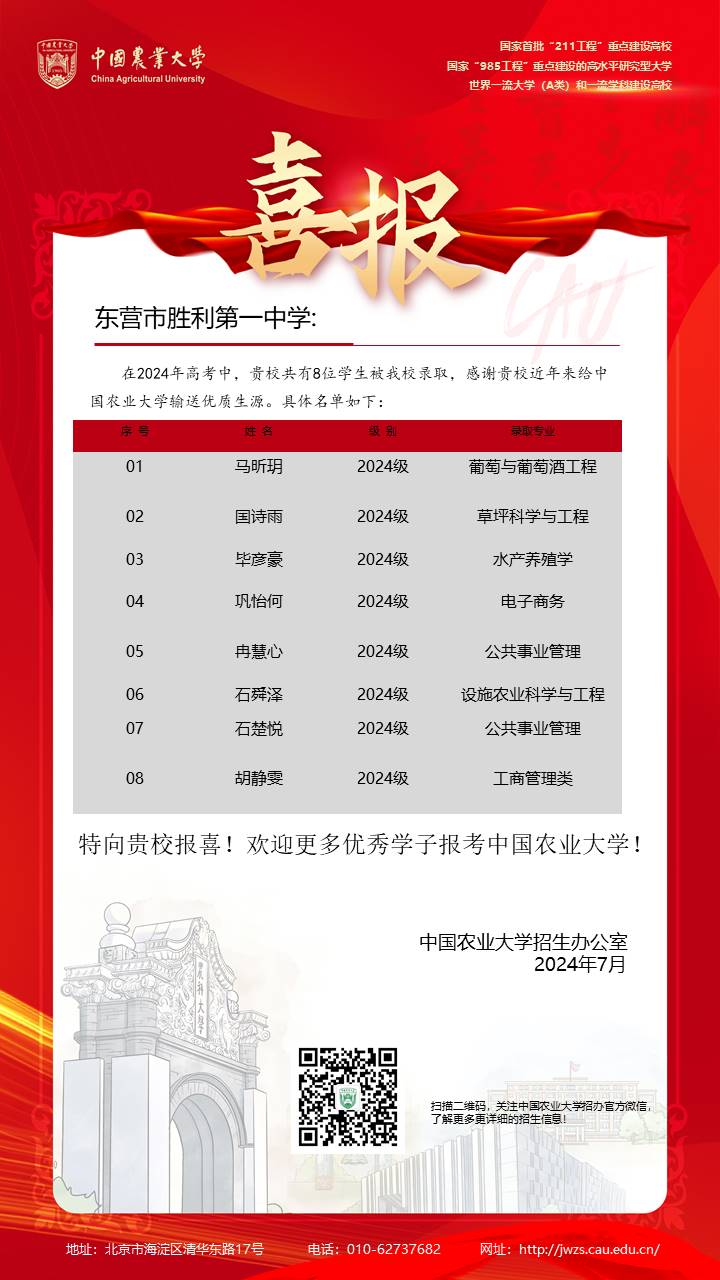 胜利一中2024届高考再获佳绩。近日,中国科学院大学、南京大学、中国人民大学和武汉大学等高校纷纷发来喜报,祝贺和感谢胜利一中每年将大量优质生源送入高等学府,并期待与我校持续深化合作,共育良才、共谋发展。