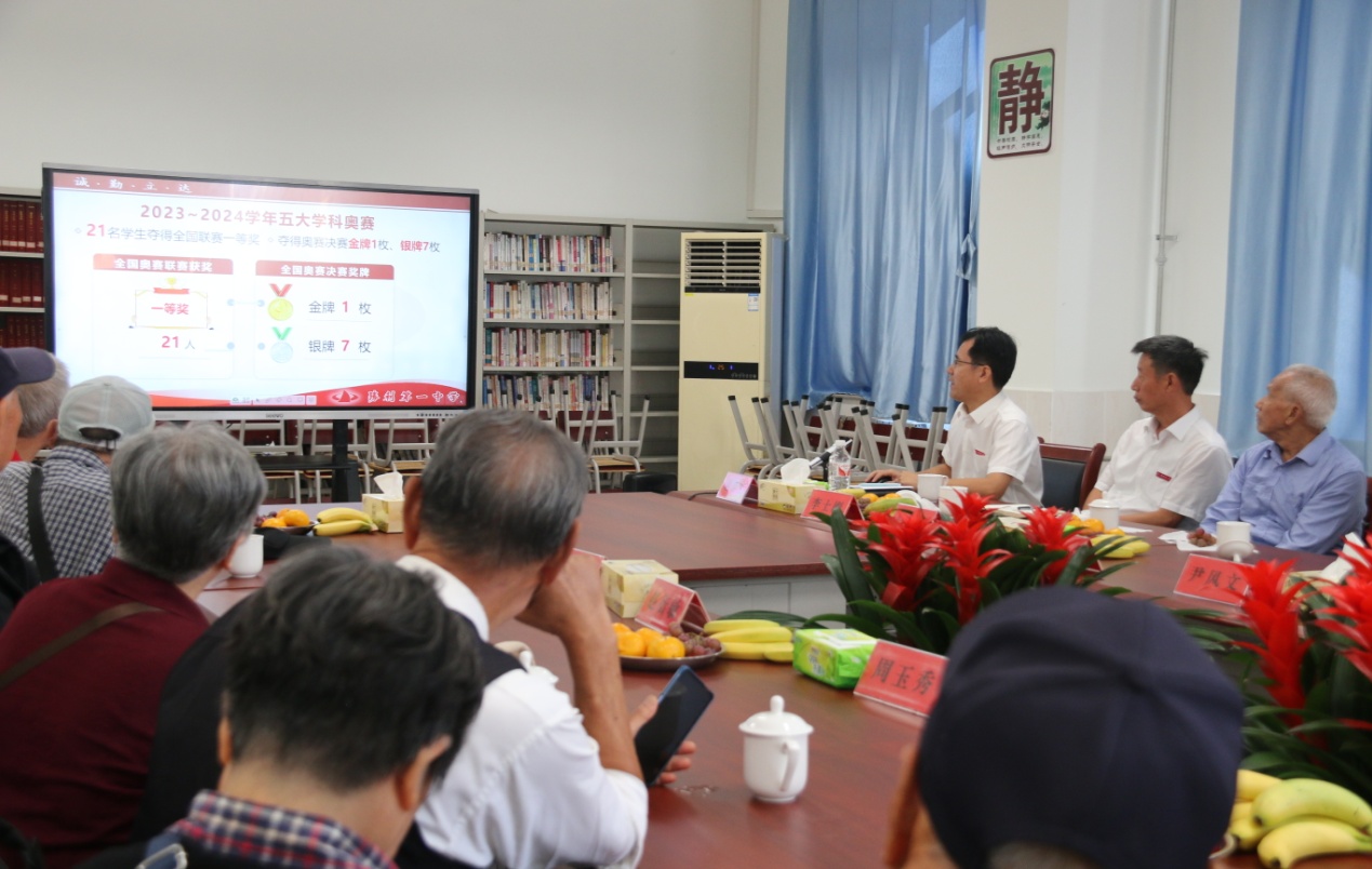 副校长谢春生汇报了学校情况。他全面介绍了近年来学校在教育教学、师资队伍、科研创新、校园文化建设等方面取得的显著成绩。胜利一中即将迎来60周年华诞,学校已正式启动甲子校庆筹备工作,诚挚邀请退休老领导和老职工积极参与其中,以此为契机汇聚力量,推动学校各项事业再上新台阶。