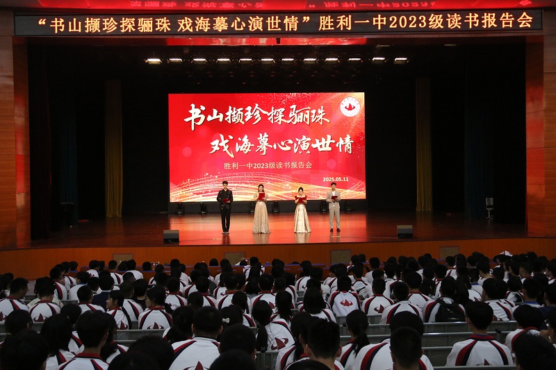 5月11日下午,胜利一中高二年级全体师生齐聚学校大礼堂,共同参与以“书山携珍探骊珠,戏海摹心演世情”为主题的读书报告会。活动通过情景剧、朗诵、演讲等多元形式,展现了文学经典的永恒魅力与时代价值。